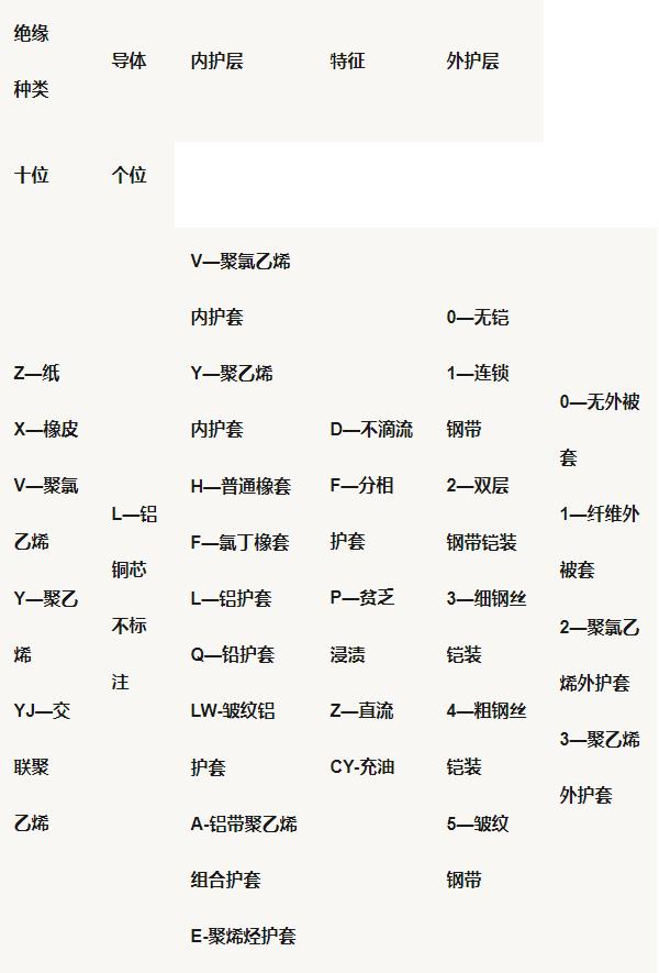 用漢語拼音第一個(gè)字母的大寫表示導(dǎo)體材料、絕緣種類、內(nèi)護(hù)層材料和結(jié)構(gòu)特點(diǎn)。